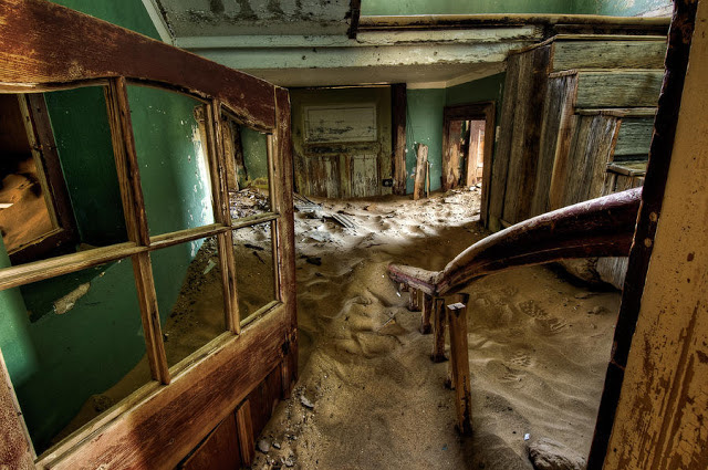 Kolmanskop adalah kota hantu di sebelah selatan Namibia beberapa kilometer kepedalaman dari pelabuhan Luderitz. Pada tahun 1908 Luderitz mengalami demam berlian, dan orang-orang kemudian menuju ke padang pasir Namib untuk mendapatkan kekayaan dengan mudah. Dalam dua tahun terciptalah sebuah kota lengkap dengan segala prasarananya seperti kasino, sekolah, rumah sakit, juga dengan bangunan tempat tinggal yang eksklusif yang berdiri di lahan yang dulunya tandus dan merupakan padang pasir luas. Namun setelah adanya Perang Dunia I, Harga Berlian menurun dratis. Sehingga mulai tahun 1950-an kota itu kosong dan tak berpenghuni lagi hingga sekarang. Segera setelah nilai berlian runtuh dan taman-taman serta jalan-jalan terkubur oleh pasir. Pintu dan jendela berderit pada engselnya. Kaca jendela banyak yang retak. Sebuah kota mati baru telah lahir. Beberapa bangunan tua masih berdiri dan beberapa interior seperti teater masih dalam kondisi terawat baik. Tetapi yang lainnya telah runtuh. Kembali dari kemegahan menjadi rumah hantu.
