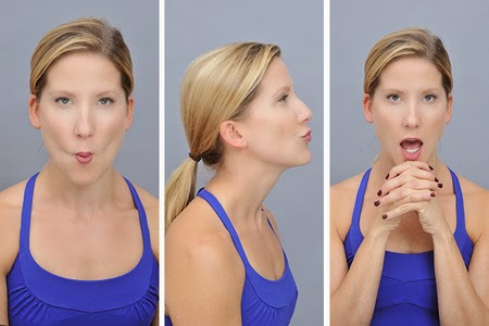 Gerakan Memperkuat Rahang dan Leher Ada tiga gerakan: kerucutkan bibir seperti ikan (fish face), mengarahkan ciuman ke atas (kissing the ceiling), dan lipat kedua tangan dengan jari-jari yang saling berkait satu sama lain lalu tarik bagian dagu (grip shake).