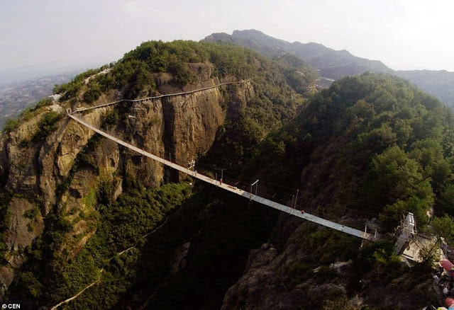 Para pekerja konstruksi Cina yang bekerja di ketinggian 180 meter di atas jurang curam, telah selesai mengubah jembatan gantung kayu di Hunan, China tengah, menjadi jembatan dengan lantai kaca yang transparan, sehingga seluruh dasar ngarai terlihat jelas.